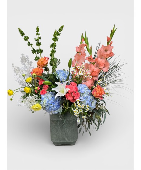 A fresh Assortment of Soft florets, including roses, hydrangea, gladiolas and foliage. This elegant blend of Vivid Peach, Orange, Yellow and Blue delicate flowers will warm their heart.