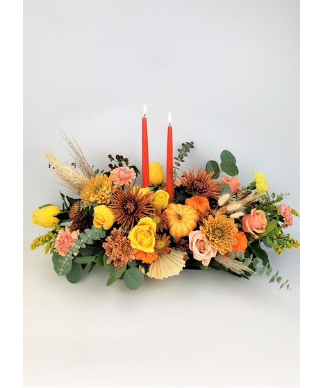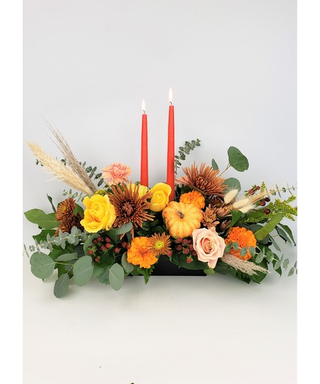 A Perfect Touch for the Perfect Gathering! This elegant centerpiece includes soft autumn colors with 2 candles. Send a gift to add the perfect touch to the Table.
