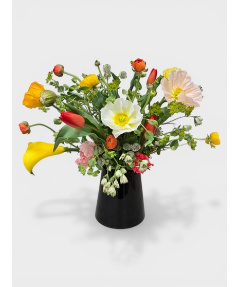 It’s designed in a sleek black vase, which makes the colors pop even more. The bouquet features a lively mix of blooms in warm, cheerful tones. Vase measures approx 6" h x 5"w. Delicate poppies in white, soft peach, and vibrant orange with sunny centers combined with bright yellow calla lilies that curve outward, adding a sculptural, modern touch. Golden and orange ranunculus and tulips bring texture and whimsy. Airy greenery and small filler blooms that give it a loose, garden-picked style