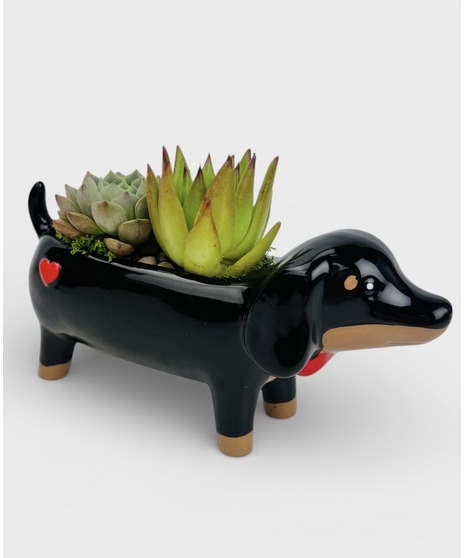 Meet Paws in Love, a charming succulent garden that’s sure to steal hearts. Designed in an adorable black dachshund planter, this playful piece features a mix of vibrant succulents nestled along its back, creating a delightful blend of greenery and whimsy. Sweet red heart accents add a loving touch, making this garden perfect for Valentine’s Day and beyond.