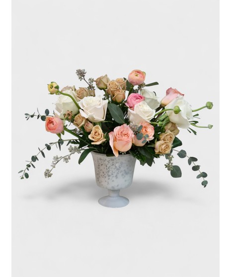 This flower arrangement is elegant and romantic, presented in mercury style glass pedestal vase. The bouquet features a mix of flowers in soft, muted tones, primarily: Roses in shades of white, cream, blush pink, and a soft peachy-beige. Eucalyptus with its round, grey-green leaves extending outward, giving a graceful and flowing shape. The arrangement has a rounded, slightly asymmetrical shape with greenery elegantly trailing to the sides, giving it a natural, garden-inspired look. It would be well-suited romantic event, or as an upscale decorative piece in a home or boutique setting.