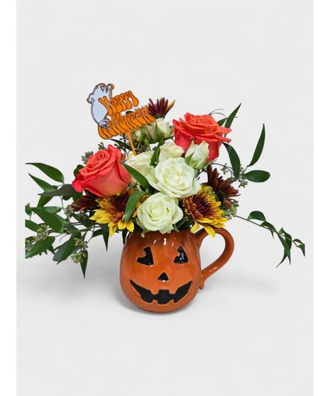 Good Mornin' Pumpkin! send a Fall treat to that wonderful someone. this Jack o lantern mug includes roses, carnations and fall style mums. Mug is deliverd with to Mylar balloons and a Candle presented in a gift bag.