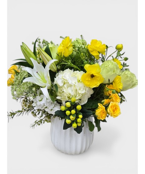 This is a bright and elegant fresh flower arrangement presented in a small, ribbed white ceramic vase. The bouquet features a cheerful mix of yellow and white blooms, creating a fresh, uplifting look. Soft white hydrangea clusters adding fullness and texture with Vibrant yellow flowers such as ranunculus and small roses, bringing warmth and brightness.