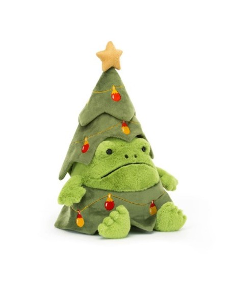 Bring the 'Bah, humbug', big-style, with Christmas Tree Ricky Rain Frog! Our squat, mossy frog wears a Christmas tree costume, with a star-topped hat and matching scalloped dress, all embroidered with baubles. Bring Ricky to the party and everyone smiles!