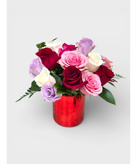 True Romance! deliver your love to that very special person. Valentine color roses blended in a striking red pot. Long lasting roses designed with fresh foliage and accent greenery.