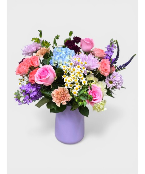Whose the Favorite? You will be if you send this beautiful design in a Rose Gold Vase with fresh Lily and roses mixed with delicate blooms and hydrangea. This design features a ceramic Lavender vase.