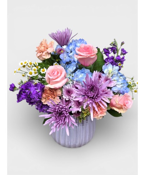 A delicate wash of lavender, periwinkle blue, and dusty rose, accented by pops of peach and creamy white in a lavender ceramic pot.