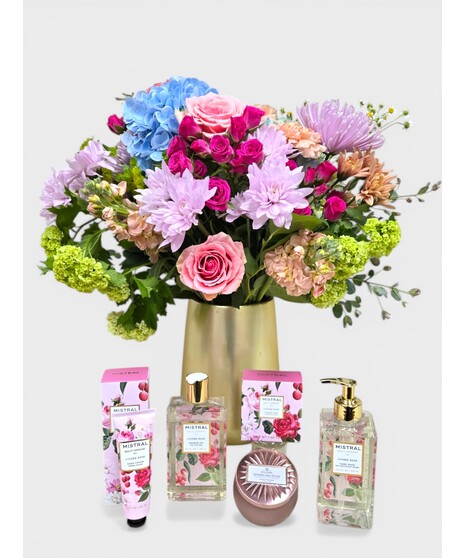 This gift set pairs a vibrant, garden-style floral arrangement with a coordinated spa collection for a thoughtful and indulgent experience.