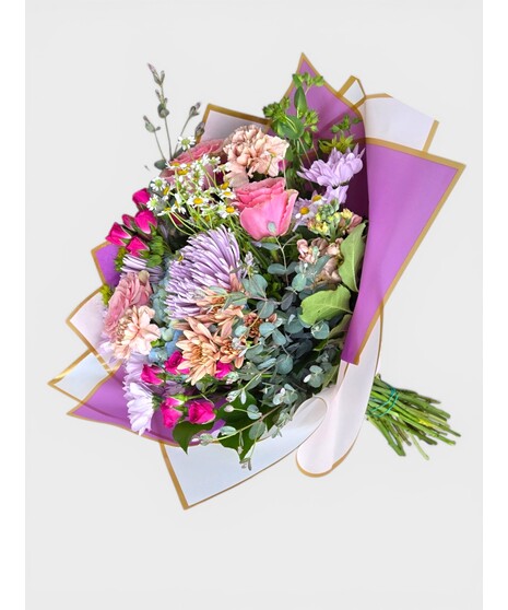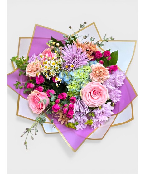 The bouquet is full and lively, arranged in a sleek gold vase. It features a cheerful mix of soft pink roses, bright fuchsia spray roses, and lavender chrysanthemums, balanced by a striking blue hydrangea that adds a cool, fresh contrast. Accents of peach-toned blooms, green viburnum, and delicate filler flowers create texture and movement, giving the arrangement a lush, just-picked-from-the-garden feel.