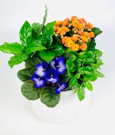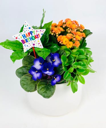 The Pot of Sunshine from Stadium Flowers in Seattle, WA, is like a cheerful embrace captured in a brightly colored ceramic dish garden. This arrangement is bursting with life, featuring a variety of blooms that come together to create a miniature garden of delight. Vivid African violets with deep blue petals complement the sunny orange hues of kalanchoe, while the fresh green foliage brings balance and freshness to the ensemble. Presented in a white ceramic container that may vary in design, the Pot of Sunshine is a joyful addition to any room, infusing it with color and vitality. With an approximate standard size of 10 inches in height and 9 inches in width, it's perfectly proportioned to bring a touch of sunshine to a side table, desk, or windowsill. The standard option is all about the plants, offering a natural and understated charm. For those looking to celebrate a special day, the deluxe version includes a bright and festive birthday pick that adds a touch of celebratory sparkle to this verdant display.