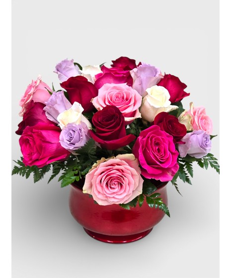 True Romance! deliver your love to that very special person. Valentine color roses blended in a striking red pot. Long lasting roses designed with fresh foliage and accent greenery.