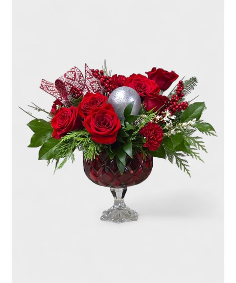 This flower arrangement is a festive and elegant display, perfect for the holiday season. It features a lush collection of deep red roses and red carnations as the focal flowers, beautifully complemented by greenery such as cedar, pine, and other evergreen foliage that add texture and a seasonal touch.