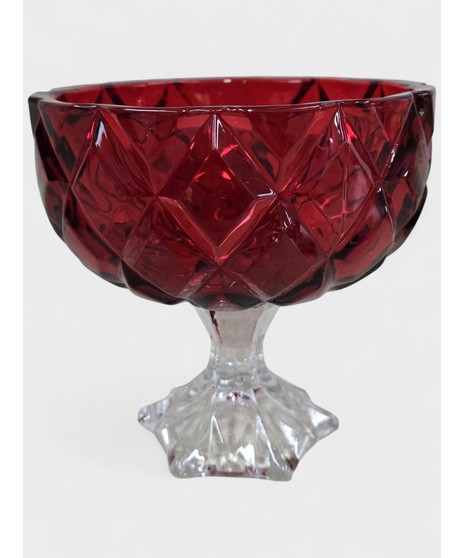 red keepsake glass compote with clear stem measures approx 7" h x 7"w