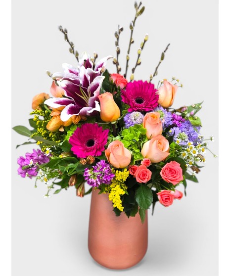 This fresh flower gift is a vibrant, garden-style arrangement bursting with color and texture, beautifully presented in a matte rose-gold ceramic vase.