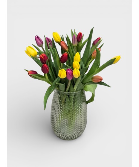 A Technicolor mix of vivid Spring! Each Vase of tulips continues to grow and expand as the day progress. Many tulips will double in size within days. Send a colorful blend of mixed tulips