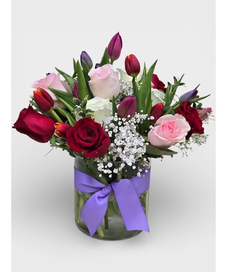 Tulips and Roses presents a romantic and richly layered composition centered on classic roses and graceful tulips. Velvety red roses, soft blush pink, and creamy white roses are artfully interwoven with jewel-toned purple and coral tulip buds, creating a striking contrast between fullness and sleek, upright lines.
