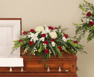 Classic casket designed with a mix or premium red and white flowers including hydrangea, roses, and lilies.