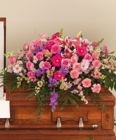 The Delicate Pink and Lavender Casket Spray is a heartfelt tapestry of affection, meticulously woven with roses, lilies, and daisies in the softest shades of pink and lavender. This floral arrangement speaks volumes of love and tender remembrance, softly draping over the casket like a comforting embrace. The roses, symbols of gratitude and grace, blend seamlessly with the innocence of daisies and the purity of lilies, creating a serene sea of florals that celebrates life with dignity and beauty. The carefully chosen palette evokes a sense of peaceful repose, honoring the cycle of life with a delicate touch.