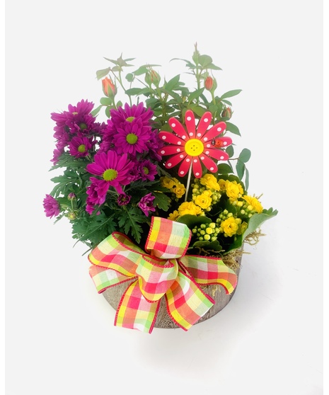 Let's delve into the lush radiance of the Vibrant Garden arrangement from Stadium Flowers in Seattle, WA, a stunning homage to the exuberance of the tropics. This arrangement is a harmonious gathering of brilliant-colored blooming plants, accompanied by the rich, verdant hues of a tropical green plant. Together, they form a vivacious symphony of textures and tones, infusing any space with life and color. Nestled within a round wooden planter that brings an earthy, organic feel, the Vibrant Garden is a microcosm of nature's diversity. The festive pick tucked among the blooms adds celebratory flair, signaling joy and festivities. With an approximate size of 11 inches wide and 13 inches high for the Deluxe version, it makes for a substantial and eye-catching centerpiece or a welcoming accent in any room.