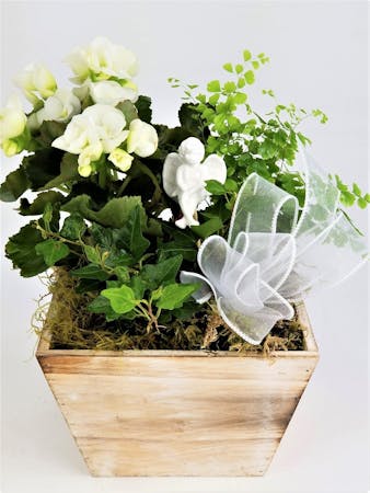 The Peaceful Memory Garden from Stadium Flowers is a serene tableau, encapsulating a moment of tranquility and remembrance within the confines of a rustic wooden box. It's a harmonious gathering of tropical green plants paired with the soft beauty of white blooming plants, creating a sanctuary of calm and serenity. Each element of this garden has been thoughtfully selected to offer comfort and a visual metaphor for peace. The lush foliage of the tropical plants represents growth and the enduring nature of life, while the purity of the white blooms signifies peace and hope. A delicate angel figurine nestles among the greenery, a gentle guardian watching over this verdant landscape, offering a silent prayer of solace.