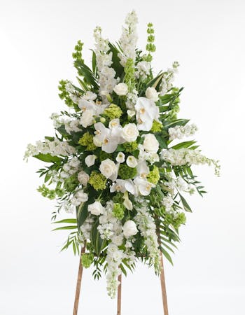Premium collection of our finest white and green blooms featuring white roses, orchids, calla lilies, hydrangea, and other premium accents displayed on an easel.
