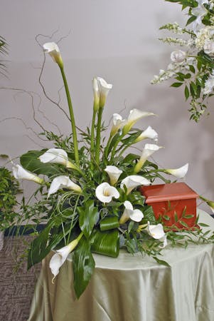 Elegant white calla lilies provide the perfect display for an urn placement or service. The Calla Lily Display is a stunning and sleek tribute that exudes a sense of peace and serenity, perfect for memorial services or as a beautiful expression of sympathy. This arrangement showcases the sublime beauty of white calla lilies, whose trumpet-shaped blooms symbolize purity, rebirth, and the soul's transition.