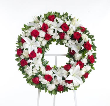 Classic wreath designed with a mix or red roses, white lilies, and other accenting flowers displayed on an easel.